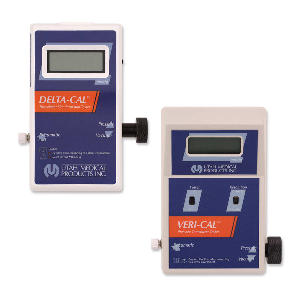 Delta-Cal™ and Veri-Cal™ are pressure transducer calibration verification devices. Veri-Cal™ allows you to test the accuracy of the pressure transducer, while the Delta-Cal™ also allows you to simulate the transducer and verify both the transducer's and the monitor's linearity, gain and accuracy at the bedside.