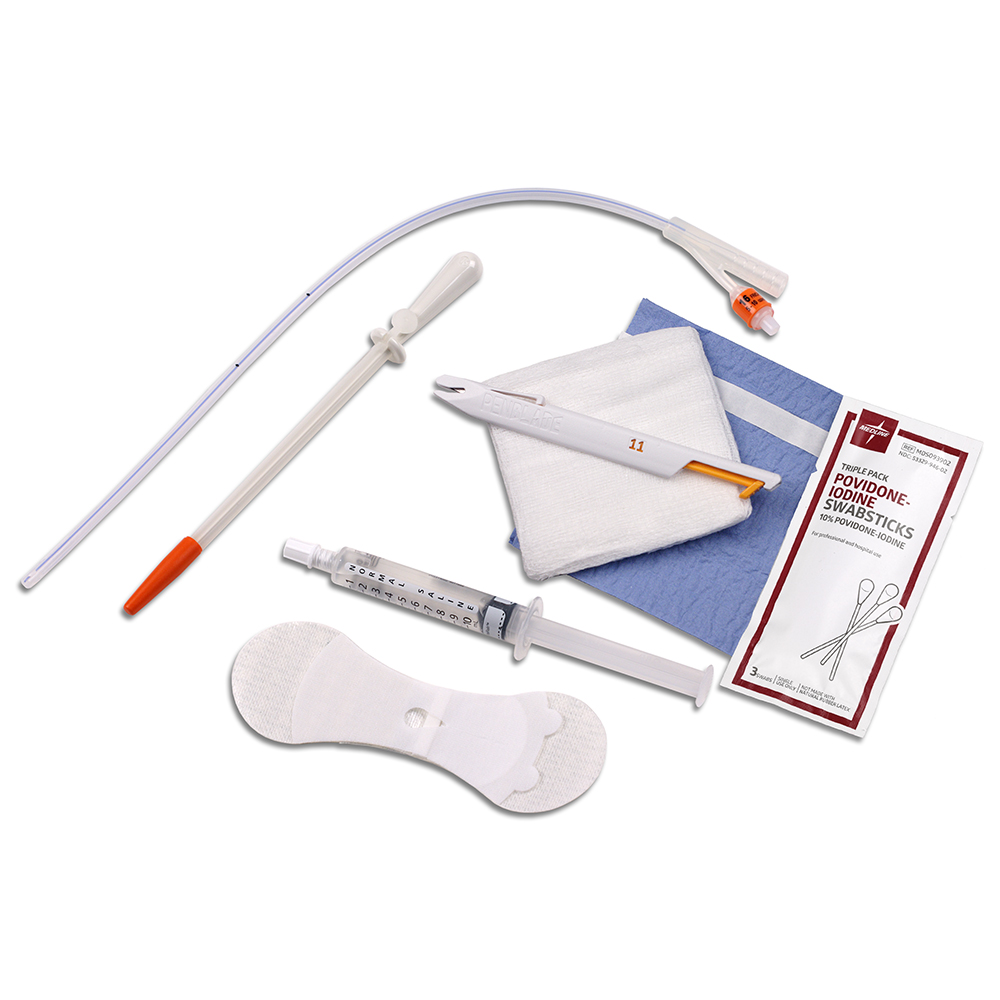 SF-S14-104 Supra-Foley® 14 Fr Suprapubic Catheterization Kit, Contents - 1ea 12/14 Fr suprapubic catheter introducer, 14 Fr silicone suprapubic catheter with balloon, fenestrated drape, 3-pack iodine swabs, 10ml saline syringe, #11 safety scalpel, catheter securement device and 4x4 gauze. 5/BOX  Supra-Foley 14 Fr Suprapubic Catheterization Kit Model SF-S14-104